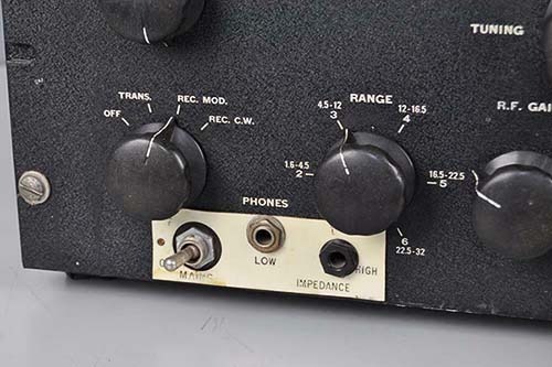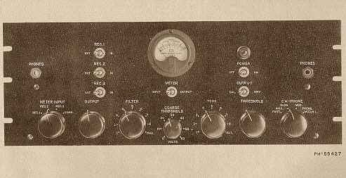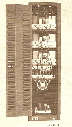 Shown in the photo left is the Monitoring Unit. This device had its own IF section, Detector, BFO and Audio Output. The Monitoring Unit was connected to the "Monitor" output on each receiver which was a connection between the 1st IF amplifier and the 2nd IF amplifier. This allowed the operator to monitor each receiver individually without upsetting the diversity reception. Separate power supply at bottom of rack. |