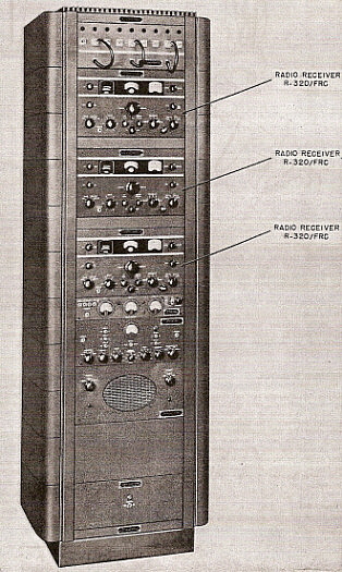 >>> The Tone Keyer uses the signal amplitude variations of a CW signal received without BFO action and uses that amplitude variation to "key" a circuit whose output is a pure tone representative of the incoming CW signal. No background noise or random minor interferences make it through the Tone Keyer. These devices were mainly used for machine copy of CW (or high-speed mechanically sent CW or RTTY) and only occasionally for human copy of CW. Also included in the rack was a Monitoring Unit. This device picked the signal up from between the 1st and 2nd IF amplifiers ("MONITOR" output on rear of chassis) of each AR-88F and routed it through its own IF section with detector-AVC , BFO and Audio Output. This allowed the operator to monitor the signals without disturbing the diversity set-up of the receivers. The three meters monitored the Diode Load current that was routed to the Tone Keyer. Before actual reception of signals in diversity, the DR-89 had to be "balanced." This required the operator to accurately tune in the desired station (or a test signal) on all three receivers. Then, using the "DIVERSITY IF GAIN" control on each receiver, the operator would adjust the output of each receiver to be equal as measured on the Meters of the Monitoring Unit (although the meters are connected through the Tone Keyer.) This compensated for differences in individual receiver/antenna overall gain and then allowed of equal diversity action of the three combined receivers. At the bottom of the rack is the speaker panel which allowed monitoring of individual receivers or one selected receiver as the diversity audio output of all three receivers. Also, at the very bottom was a power supply to operate the Monitoring Unit and at the very top of the rack was a patch panel for various antenna inputs. Other Triple Diversity Receivers RDM - U.S. Navy designation for the DR-89. The Navy version is identical to the RCA DR-89. Mostly used during WWII. The receivers are identified as CRV-46246B and are either AR-88F or later CR-88A models. The photos show the RDM. Documentation became "Unclassified" in June 1947. OA-58A/FRC - Signal Corps Triple Diversity set-up using three SC-88 (Signal Corps designation is R-320/FRC) receivers from 1949-1950. The auxiliary components are slightly changed in appearance but have same design and function as in the DR-89 and the RDM. The R-320/FRC is an updated version of the AR-88F. A photo of the OA-58A/FRC is shown below.