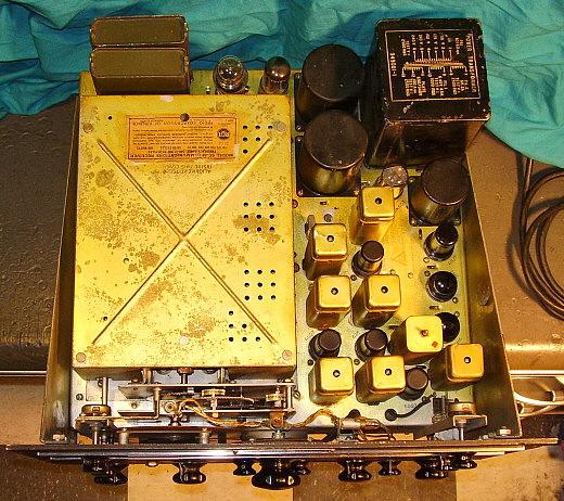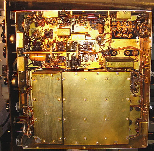| The photos below show the top of the SC-88 chassis and the underneath of the chassis. All shields are shown installed except for the bottom cover that had to be removed for the photograph. The shields kept the LO radiation at an extremely low level so the receivers could operate in the presence of multiple receiver installations with no interference generated or received (as in the OA-58A/FRC.) What's immediately apparent is that the SC-88 was given a typical Signal Corps "heavy duty" MFP treatment,...both on top of the chassis and even underneath,...even though there's a bottom cover that almost seals the underside of the chassis. This thick coating of fungicide treatment has probably helped to preserve the metal parts over the years,...that, and the fact that the receiver has been in dry, dry Northwestern Nevada near the east slope of the Sierra for over half-a-century. |