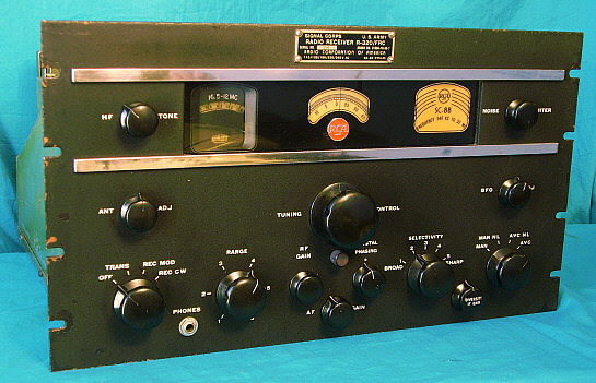 SC-88 - SIGNAL CORPS - R-320/FRC Shown in the photo to the right is the SC-88 receiver. It's actual designation is R-320/FRC and it was used in the Signal Corps OA-58A/FRC triple diversity receiver. The SC-88 is one of the last of the AR-88 versions produced with most receivers built between 1949 and 1950. The SC-88 receiver has the later feature of the Crystal Phasing control on the front panel with smaller knobs for the RF and AF Gain. The SC-88 was the first version to have the "Band-in-Use" Dial Mask. The mask has the frequency ranges printed on it so the frequency ranges were eliminated from the front panel RANGE switch nomenclature. The receivers were MFP'd and the chassis appears gold colored because of it. Note the small knob on the lower right of the panel, between and slightly lower than the SELECTIVITY and AVC-MAN controls. This is the "DIVERSITY IF GAIN" control found on ALL receivers that were used in the RCA Triple Diversity Receivers. All of the SC-88 receivers were originally rack mounted configuration. Additionally, all known SC-88 examples have (or had) the Signal Corps R-320/FRC metal tag on the front panel, top-center and this is the only place that the serial number was stamped. One obvious change from the typical AR-88 can be seen in the photo below-left showing the SC-88 chassis. There are two individual filter capacitors on top of the chassis and one filter capacitor under the chassis. These were to replace the earlier filter capacitor unit that had all three filter capacitors inside the same can. This may have been more of an economics issue besides reliability. With the failure of one filter capacitor the entire unit had to be replaced in the earlier receivers. Later receivers, like the SC-88, only require that the defective capacitor be replaced. Another change is the BFO can which now doesn't have the removable cap on the top of the can. Also, the BFO is now coupled to the third IF amplifier grid with a 10pf capacitor (rather than using electrostatic coupling.) Additionally, the mounting of the main dial lamp is now on a bracket rather than clipped to the front plate of the gear box and the lamp shield for the illuminated ID plate has been eliminated. Located just behind the 1st IF transformer is the plug-in, HC-6 type, 455kc crystal for the crystal filter. In the earlier models of the AR-88 series, the crystal was mounted under the chassis. It was placed in a clip but was hard-wired into the circuit. The alignment adjustments for the 1st RF/ANT stage are now mounted on top of the chassis (under the RF cover) rather than having to access them through holes in the rear of the chassis. The "plunger type" trimmer capacitors are replaced with standard trimmer capacitors. "Cool Ohm" resistors are used in place of "Ohmite" resistors. Since a dial mask is used, the main dial is not alternating black and yellow band scales like the standard AR-88. Instead, the dial is entirely yellow. The front panel is painted ultra-fine wrinkle finish black. The total production of SC-88 receivers was quite small with estimates usually being around 300 receivers built. It's interesting that in the early sixties, Fair Radio Sales offered R-320/SC-88 receivers for sale (listed in Catalogs Spring-Summer '62 and Fall '62-Winter'63.). The price was $185 checked for operation and $170 if unchecked. A "new" cabinet was offered for an extra $10. Shipping weight was 98 lbs but the receiver actually weighs about 75 pounds. The availability didn't last and by a few catalogs later the SC-88 was replaced with AR-88s for sale at $175 checked for operation. It's probable that most of the surviving SC-88 receivers ended up being purchased from Fair Radio Sales. The U.S. Army Signal Corps manual for the R-320/FRC is TM11-899 and copies of this manual are still available from Fair Radio. >>> |