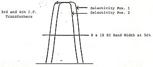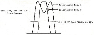 2nd, 3rd & 4th IF Transformers Actual 'scope patterns shown to the right with POS 2 on the left and POS 1 on the right. The patterns are similar to the drawings although the dip in the POS 1 pattern is not centered and is a little bit sharper. POS 2 is a nice flat pattern, though rising slightly to the left. Note the width difference between POS 1 and POS 2. |