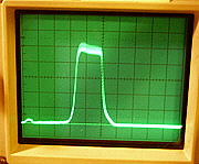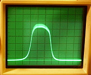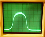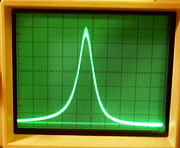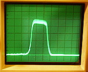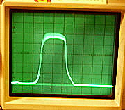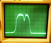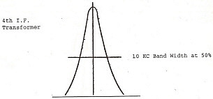 4th IF Transformer Only The oscilloscope pattern to the right shows the actual pattern on a rebuilt AR-88D receiver. Compare this to the drawing from the manual shown and you'll note that the actual pattern is very similar although a bit sharper at the peak. This scope pattern could be broadened out with the oscilloscope controls but it is only necessary to obtain a symmetrical pattern at this point. |