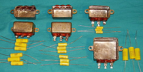There are six triple capacitor metal tub mount units used in the AR-88. These were removed and using a large old-style soldering iron, the bottoms removed - details (and a PCB oil warning) about the procedure is above in Restoration Suggestions in Part 2 of this article (also an update on using a Dremel Tool and cut-off wheel instead of the large soldering iron - much faster and a lot cleaner.) I chose to install the polyester film type of capacitors because they fit into the metal tubs and are excellent replacement capacitors. I don't put the bottom back on the tub for two reasons - first, it's not necessary since the tub is mounted up against the chassis and second, removal of the bottom ends up destroying the bottom cover anyway. |