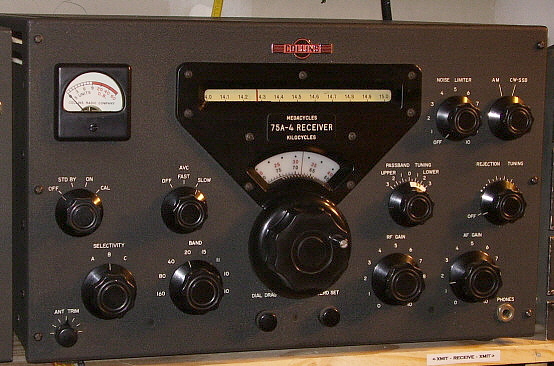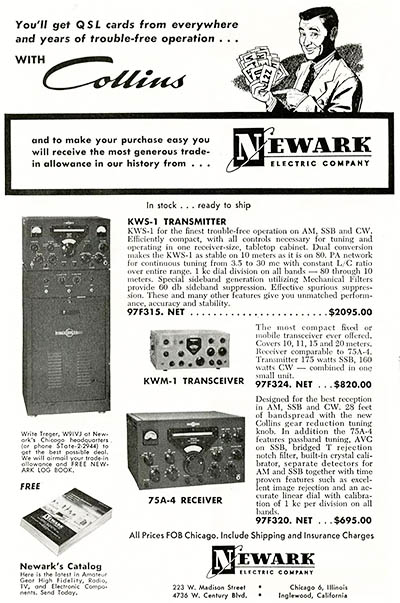 The KWS-1 - was an incredible transmitter when it was introduced in 1955. At a time when AM dominated the voice mode of communications, Collins introduced a high-power SSB transmitter that was built to military specifications and had the most modern (at the time) method of carrier suppression (a balanced ring modulator) and a dual crystal-controlled carrier oscillator for shifting upper or lower sideband frequencies with a Collins mechanical filter for suppression of the unwanted sideband. The transmitter used a Collins PTO and crystal controlled oscillators in combination with mixer stages for a coverage of 80M through 10M (1mc wide bands that covered the HF amateur bands,) for dial accuracy to the kilocycle and to virtually eliminate frequency drift. The power amplifier was linear Class AB1 and used a pair of force-air cooled, external anode final amplifier tubes, 4X150 types. A separate power supply unit had electronic voltage regulation for PA screen voltages (other voltage regulation was in the desk top transmitter unit) and a squirrel-cage blower supplied the air flow necessary to cool the finals. Due to its military-type construction the KWS-1 was expensive,... so expensive, only a genuine enthusiast would pay the expected high price of $2095. Judging by the number of KWS-1 survivors, there were actually quite a few ham enthusiasts that purchased KWS-1 transmitters. However many KWS-1 transmitters were also purchased by the military with some of those going to MARS use and also a few commercial users, so the actual number of ham-owners is not really known. Production of the KWS-1 ran from 1955 up to 1958. It's generally thought that about 1800 units built and sold during that time. The 75A-4 - was introduced in 1955 and manufactured up to about 1958 or so, with around 6000 receivers for total production. The initial selling price started around $500 and continued to escalate to $695 at the end of production in 1958. The 22 tube circuit featured a 3.1 kc mechanical filter and a product detector, making the 75A-4 ready for SSB - but it could also copy AM quite well since a separate AM envelope detector was also provided. >>> |