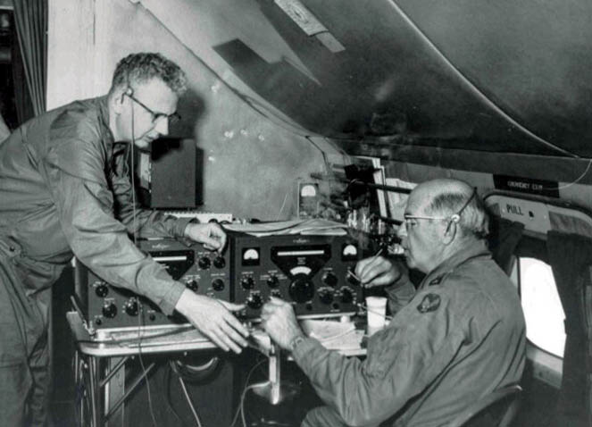 and sensitivity was competitive. The USAF SSB Test Using the KWS-1 and 75A-4 - The ham enthusiasts certainly had been following the well-publicized "test flights" that involved Art Collins and USAF General Francis "Butch" Griswold along with General Curtis LeMay and the USAF. The "SSB Tests" were two flights of a C97 "Stratofreighter" airplane that was equipped with the KWS-1 and two 75A-4 receivers to prove that reliable HF-Voice communication from half-way around the world to Offutt AFB in Omaha, Nebraska was possible using SSB. The first test flight was from Offutt AFB out to Okinawa and back from March 25 through April 3, 1956. SAC wanted another test that involved the polar regions that were where SAC typically operated and that area was noted for difficult radio propagation. The second "test flight" went to the polar regions above Greenland and back to Offett AFB on June 29 through July 7, 1956. Radio amateurs were also part of the communications for both flights with contacts made being logged and QSLs sent to confirm the contact. The radio equipment was essentially a stock KWS-1 with the exception of the aircraft-type shock mounts and that the KWS-1 blower motor had to be changed to operate on the 400~ AC. The equipment table had the 75A-4 on the left and the KWS-1 on the right. The KWS-1 power supply was behind the left side of the desk and behind the 75A-4. A second 75A-4 was placed on top of the KWS-1 power supply facing out toward the center of the fuselage. A 270G-3 loudspeaker was on top of the desk-mounted 75A-4 (that also was on an aircraft shock-mount.) There was a Collins 180S-1 antenna coupler used to match the aircraft wire antennas although it's not seen in the photographs since it was mounted on the fuselage wall where the wire antenna exited. There was another piece of equipment to the right of the KWS-1 that appeared to be a station control for switching antennas and other operational functioning. The photos show an Electro-Voice 664 microphone being used and that implies that the VOX was used to control the T-R function. Although testing SSB communications was the primary purpose, note that a "bug" is to the right of the EV-664 mike (maybe for CW but probably for "tuning up" the KWS-1.) |
