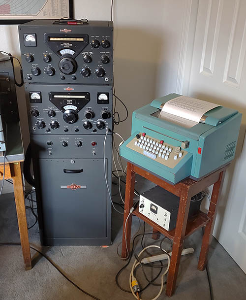 own sn:616 and that it's here in Dayton Valley, Nevada.) More Recent History - SN 616 was my main transmitter for many years and has proven to be a super-flexible unit capable of high power SSB and CW with reduced power AM and RTTY communications. I ran RTTY with the KWS-1 from 1974 up to 1980 out of Gardnerville, Nevada. There was a 10-year time period from 1980 up to around 1990 when the KWS-1 was in storage inside a large, well-insulated pump house on our Minden, Nevada property back then. It managed to survive this neglect without any issues since the pump house was very dry and well-insulated (it never got below freezing and never got any warmer than about 80ºF - and it was dark, unless I opened the door - or left the light on for heat during the winter.) In fact, the KWS-1 has only had routine maintenance performed on it over the years (meaning the KWS-1 is mostly all original.) The Service Bulletin changes and other Collins ECO-type changes that have been incorporated are removal of the fiberglass insulation from inside the PA box, installation of Collins heat-reducing tube shields, replace 866A tubes with 3B28 tubes, replace 4X150 tubes with 4CX250B tubes and I added a rubber isolation mount for the auxiliary relay inside the KWS-1 chassis. I did have to repair a broken flex connection on one of the roller inductors several years ago, also a broken wire in the microphone connector. In 2007, I set up the KWS-1 and 75A-4 to run RTTY using a Model 19ASR machine I had owned since 1974. I had everything set up in the basement in Virginia City, Nevada and the station ran great but I only contacted a few "real machine" RTTY enthusiasts. I did another set up in Dayton Valley in 2021 using the KWS-1 and 75A-4 to run "real machine" RTTY. I used my homebrew TU and got good RTTY copy but the transmitting end of things didn't go so well. I was using my Model 28 Compact (an ultra-small, desk-top Model 28) that works very well. The problem was the KWS-1 was f-drifting too much for modern transceivers (or maybe it's too much f-drift for modern RTTY operators,...but more on that further down.) I now occasionally use the KWS-1 on AM on the Vintage Military Radio Net where it provides a unique type of AM for enthusiasts to hear - one selectable sideband with carrier. The KWS-1 transmitters have a long association with military MARS stations, especially with the 1957 Geophysical Year and the MARS operators out of Antarctica. The KWS-1 is certainly one of the best from the "Golden Age of Ham Radio." |