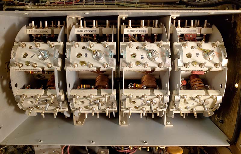 In checking out this problem I found that, sometime in the past, the SP-600-VLF's CW-MOD switch had been rotated 180º (the electrical connections, that is,) for some reason and the wires apparently moved to be correct for that rotation,...but the connection of the .25mfd timing cap for CW was connected to the opposite switch tab than to where it should have been connected. But correcting the switch wiring just moved the problem from MAN to CW. The actual problem was C153, the .25uf timing capacitor having significant leakage current (not a short but getting close.) C153 is a "metal tub" package and probably a paper-dielectric capacitor. Since one side of C153 was connected to the AVC line and the other end was switched to ground when CW was selected, when CW was selected the AVC bias was shorted (somewhat) to chassis-ground and that reduced the AVC bias to about -2.5vdc when it should have been around -40vdc (RF Gain at 1 in MAN.) I disconnected C153 and clip-lead connected a Sprague Orange Drop .2uf in its place. Then, switching between CW and MOD didn't make any difference in the signal level whether in AVC or in MAN or whether in CW or MOD. I added two insulated thread-on stand-offs to the component board (just above C153) and installed the Sprague Orange Drop between the stand-offs and connected the wires (one to the AVC bias line and the other wire to the CW-MOD switch) appropriately. Now, the SP-600-VLF can be switched in any combination of AVC-MAN or CW-MOD and the grid bias doesn't change and the output level of the receiver remains constant. NOTE: Since C153 had for years been connected to the wrong tab on the CW-MOD switch, when CW was selected then C153 was out of the circuit. Since I listened almost exclusively in the CW mode, this problem never showed up unless I selected MOD, which didn't happen normally,...except for testing. It was a problem I noticed but since it didn't affect CW, I didn't pursue the problem until now. I'm glad I did since now I can easily switch between CW and MOD to check the signal and there isn't a deafening roar in the 'phones. So, why didn't I rebuild C153? I left C153 in the receiver just in case. But, with the rear phone jack for 600Z output mod, I figured that originality of the receiver had been already compromised. If I decide to clean-up and remove the rear phone jack then I'll rebuild the C153 tub and remove the Orange Drop cap. The final step of the check out will be an alignment - not the manual's impossible to perform alignment - but an alignment that considers the SP-600-VLF31 is a standard single conversion superhet and should be aligned following the standard alignment procedures for superhets including an IF sweep alignment. Cleaning - I guess I was too excited when I got this SP-600-VLF31 ten years ago to bother with much cleaning. I assumed all of the little black spots were corrosion since they didn't wipe off with Glass Plus. This time, I took a closer look and discovered that WD-40 removed the spots and didn't damage the iridite or anodized metal finishes. I think the spots were either from spiders or from flies. Either insect's excretions are quite corrosive but the WD-40 removed the dark deposits and left a very small "dot" that was a lighter color than the metal finish. The "dots" aren't very noticeable unless one was looking for them. The improvement in upper chassis appearance is significant. Only the power transformer and one of the filter chokes have compromised paint on their top surfaces. Many of the HF SP-600 receivers are found with repainted transformers since the large flat surface had a tendency to hold moisture resulting in the paint problems and oxidation. A paint touch-up is the only solution for the top surfaces of the power transformer and the one filter choke. Inspection Prior to Alignment - I'm going to remove each of the coil assemblies in the turret for close, detailed inspection. SP-600-VLF31 sn:20101 had one coil assembly, 2RF3, that had solder issues probably due to someone trying to follow the manual's procedure of lifting resistor leads to reduce loading so that the RF RMS voltage could be measured (or maybe some just troubleshooting and causing problems.) This soldering problem left Band 3 non-functional. I've already noticed that all of the contact stub pins are coated with something. It could be old remains of tuner grease or maybe light oxidation. I haven't even pulled the coil assemblies yet and that potential contact problem was noted. I'm also going to check each of components and wire connections that are referenced in the manual's procedure for unsoldering for disconnection, align and then soldering for reconnect, just to verify that everything is correctly reassembled and that if there was soldering involved it was a quality job (no evidence of tampering with the original soldering was found.) I just can't believe that Hammarlund thought it was a good idea to have alignment technicians poking-around unsoldering lots of components just for an alignment procedure. It's just asking for trouble. As I mentioned, when I first worked on this SP-600-VLF31 Band 3 didn't work and the problem was caused by sloppy soldering in the turret coil assemblies.