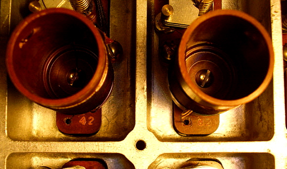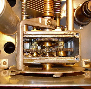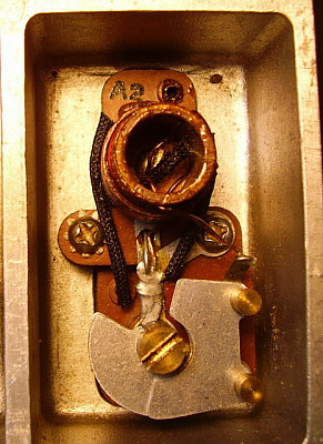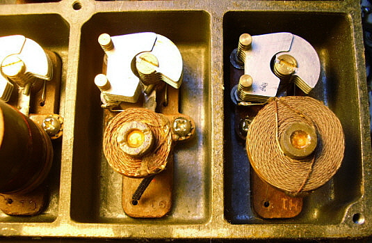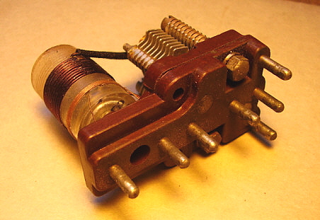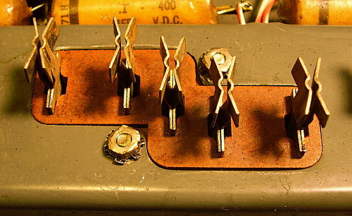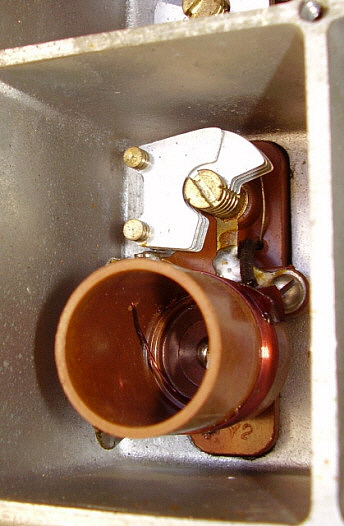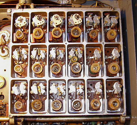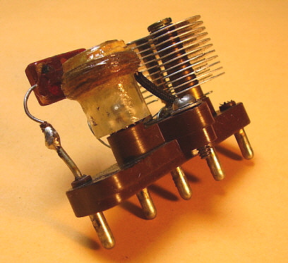 The two-piece engagement contacts are insulated from each other and when the connections are soldered on the top side (under the tuning condenser) both sides of the upper part of the contact are soldered together. The exception is the foremost LO contact. Since the LO only requires four connections, the unused contact is wired to act as a screen voltage switch for the RF and IF amplifiers to eliminate noise during band changes on the early models of the receiver. Later models used this contact for the RF amplifier cathode return to "mute" the receiver during band changing. The almost "sealed" nature of the catacomb construction generally protects the coils and trimmer capacitors from damage. Nowadays, most catacomb coils are still in good condition even if the rest of the receiver has not faired so well. |