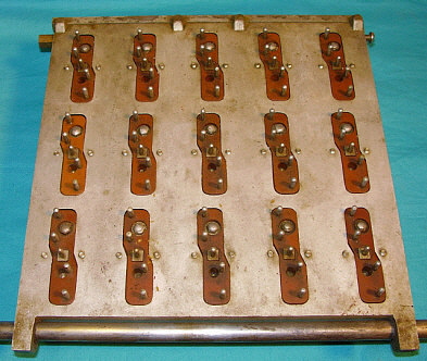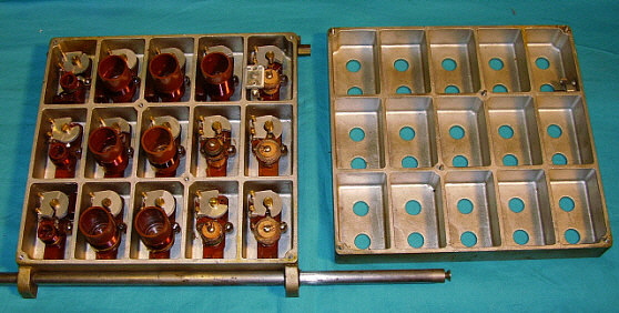 | The "Moving Coil" Catacomb - Just as the plug-in coil sets and the PW gear drive and tuning condenser are the "heart" of the HRO design, the "Moving Coil" Catacomb along with its N-PW gear drive and tuning condenser are the "heart" of the NC-100 Series. The Coil Catacomb is a two-piece cast aluminum box containing fifteen tuned coils and their respective trimmer variable capacitors. Each coil is inside a singular chamber that completely shields all of the coils from one another and from the rest of the receiver circuitry. Each coil assembly is mounted with two screws accessible by removing the catacomb cover. The coil insulator blocks each have five short, stubby pins that make the contact to the tuning condenser section to complete the tuned circuit. Each coil assembly is identified with a letter-number combination to assure proper installation. The insulator material is National's brown bakelite mixture called R-39, noted for its superior quality over standard bakelite. Robust in construction, the Coil Catacomb assured that the tuned circuit alignments stayed in adjustment and that receiver stability was solid and consistent of long periods of time. The engagement contacts are located in R-39 insulator blocks that are mounted under the tuning condenser. This allows the connections from these contacts to be very short and accomplished with TC wire. The contacts are dual entry in design allowing the Coil Catacomb pins to enter from either side. This allows the bands to be changed from any direction. |