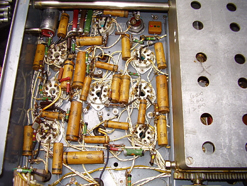 all of the knobs and bottom panel. This completes reassembly. photo right: This is the chassis of sn: 194 after cleaning. Note the older style filter capacitors. The tops of the filter capacitors were eventually painted silver so they didn't look so much like derelicts. |