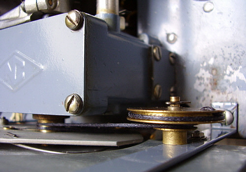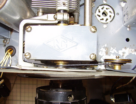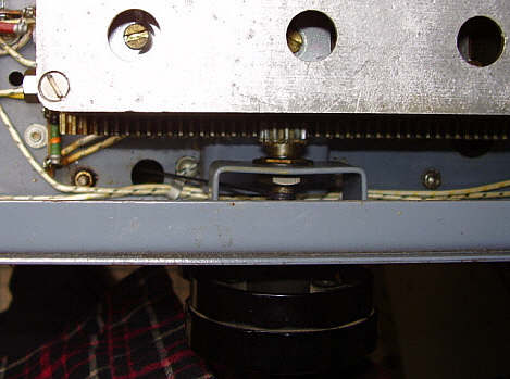 some.) Note in the photo to the right that the dial cord wraps over the shaft in a clockwise direction when viewed as shown. You have to tie a knot in one end of the dial cord and then route it thru the hole in the shaft making sure that you end up with the cord going over the shaft as shown. Be sure that the coil box is set to the lowest frequency band (box all the way to the right as viewed from the bottom-front.) Route the dial cord thru the hole in the chassis as shown. Next, look at the photo below-left and note that the dial cord exits the chassis hole and is routed up to the large sheeve of the dual pulley. Be sure you wrap the dial cord counter-clockwise (viewed as shown.) You will have to wrap the cord at minimum one and a half turns. You will see that there are two holes in the dual pulley that allow you to thread the cord thru the upper hole to a lower hole to allow the cord to wrap around the small sheeve of the dual pulley. The cord is only going to wrap over the small sheeve and then be routed to the top of tuning dial shaft. Looking closely at both bottom photos, you can see that the cord wraps over the tuning shaft and down to the small pulley that works the dial pointer lifter. Loop the cord around this small pulley and back up to the tuning shaft. Route the dial cord over the tuning shaft and down to the tie point that is mounted to the chassis. |