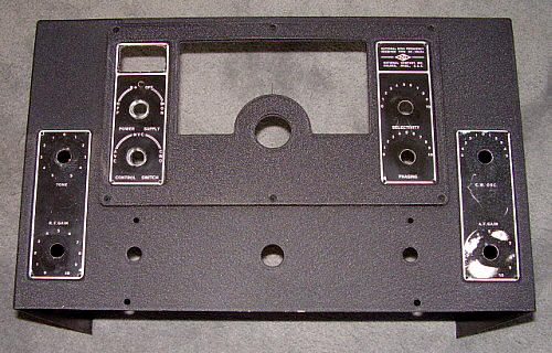 Re-doing the Gold Tone - This finish was almost totally worn off from years of use. It wasn't an electroplating but rather was a gold tone lacquer that wasn't very durable. I initially thought the gold tone was smoker's residue but tobacco deposits are water soluble and this toned lacquer, of course, wasn't. My "tip off" to the true nature of the gold tone came when I removed the large brown bakelite tuning knob from its skirt. There, protected by the knob, was the original color finish - a light gold color (about the color of beer.) I was lucky to have a special yellow toning nitrocellulose lacquer that had been mixed for me several years ago for duplicating amber lacquer finishes. I had found that diluted a little, this lacquer also duplicated MFP coatings (without the smell.) I had also used this lacquer to duplicate the gold finish on HRO crystal filter boxes, so I knew this would work fine for the gold tone necessary for the Silver Anniversary. Mixed about 3 to 1 with thinner and lightly sprayed, the yellow lacquer duplicated the color found under the tuning knob exactly. I also shot all of the nomenclature plates since the two Crystal Filter plates still had their gold tone present indicating that all of these plates were also gold tone. |