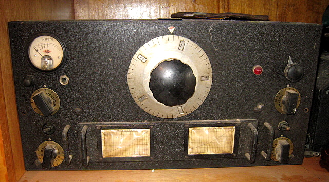 HRO Senior SN: 170-H - This HRO is from Great Britain and dates from about 1940. It is owned by John G3SLX. 170-H is in great original condition and features an unusually heavy texture wrinkle finish paint. Note the plug-in crystal on top of the Crystal Filter. |