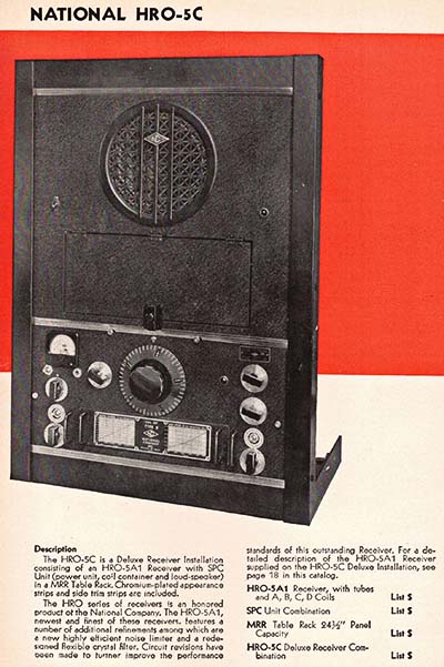 me. I had to take the receiver and the SPC out of the rack to be able to move it easily. SN: 184 0009 was installed in the correct MRR rack although the side trim pieces weren't present. The SPC unit had a Type 697 power supply mounted on top of the coil box. This 697 was built on a regular chassis using a potted power transformer, potted choke, can electrolytic and a 5Y3 rectifier tube (serial number was 200 0009 indicating the original 697 power supply.) Also, mounted on top of the coil box was an aftermarket 100kc crystal calibrator (Hammarlund) that was wired into the 697 using a fairly crude-looking harness. The calibrator power switch was mounted on the left side of the SPC panel (a stock hole for a pilot lamp was used.) There were four coil sets in the SPC and one in the receiver. Coil sets D, C and B were matching "0009" serial numbers but coil A wasn't matching and the last coil was a HRO-5 AC coil (15M BS) with a HRO-7 15 meter graph installed. At the time SN: 184 0009 was originally sold, 15M wasn't a ham band yet. The AC coil was certainly a later creation that was put together from parts after 15M was opened (there weren't any 15M BS coils available for the HRO-5A1.) The receiver, being a rack mount, has a dust cover. Originally it didn't have a lid so access to tubes required dust cover removal. A former owner modified the dust cover to have a lid. Although relatively neatly done, the design wasn't thought out very well since there isn't a stop for the lid. To keep the lid from resting on the tuning condenser, a screw with electrician's tape wrapped on it was wedged into one of the upper dust cover mounting screw holes (these two upper dust cover screws were cut off.) The receiver itself appeared to be in good, not extensively modified condition. The receiver was called the "HRO-5C" or "HRO-5C Deluxe Receiver Combination." In earlier versions of a deluxe, rack-mount HRO receiver with rack speaker and coil storage, this type of combination was available as early as 1941. This version is from late-1946 and consists of the HRO-5RA1 receiver, the SPC coil storage box and loudspeaker panel with 697 chassis type power supply mounted on the coil box behind the loudspeaker. These units were mounted in the MRR table rack that included side mount trim rails and three stainless steel trim strips.