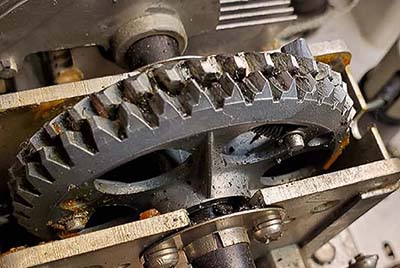 I decided to use the RAS-5 tuning condenser because the RAS-5 receiver is damaged by excessive modifications and unnecessary cutting and hacking. It's beyond restoration. Removal of the tuning condenser assembly wouldn't affect the RAS status at all. The HRO-60 receivers were actually complete, working sets although they had serious cosmetic problems. I didn't want to relegate the HRO-60s to "parts set" status. With thorough cleaning and use of the cad-plated gearbox cap, when installed, the gray paint of the RAS-5 tuning condenser shouldn't be too obvious. PW Gearbox photo shows the extreme wear and damage to the gear teeth. The problem was caused by an excessive anti-backlash setting. Worm gear was extracted before the photo was taken. Note that the left side gear teeth are not worn since they never engage the worm gear but the right side gear teeth are half-worn-through with extreme wear. |