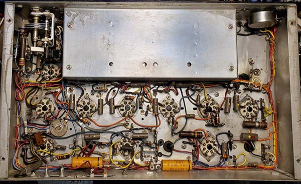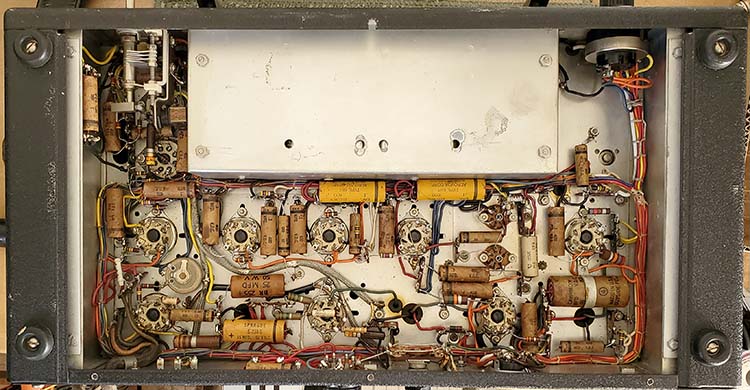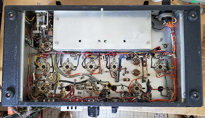rebuild. Next is the electronics rebuild. June 10, 2019 - Preliminary Test - I connected a "dog house" 697 power supply and a MCS table speaker to the HRO-5RA1 just to see how it would function with the RAS-5 tuning condenser. The one "loose" capacitor was the cathode bypass on the first RF amplifier. This was reinstalled before power-up. With the AC turned on the receiver eventually showed some signs of "life." Nothing could be heard while tuning around the 40M band with a 20ft wire for the antenna. I injected a 456kc signal into the mixer grid and a strong carrier resulted. I injected a 5mc signal into the antenna and tuning the receiver to 230 on the PW-D I did hear the signal generator. However, it sounded like the generator was acting as the LO. In another test, I injected 5.455mc into the LO grid lead with the LO tube pulled. I tuned in WWV 5.0mc using the signal generator. This showed that the receiver was functional except for the LO. |