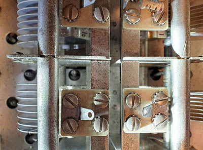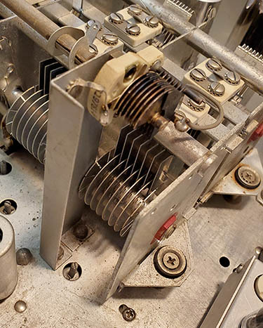 Instability and Frequency Drift - However, even though getting the 6BZ7 operating correctly did improve erratic frequency excursions, there are other mechanical design or construction issues that also have an effect on the frequency stability. Things that "flex" and physically move range from the Antenna Trimmer control up to the entire receiver chassis. Adjustment of the Antenna Trimmer especially will cause momentary frequency wobbling. It's caused by the ultra-thin and long metal bracket that's mounted right next to the rotor of the rear section of the bandspread tuning condenser. The bracket is very close, probably 0.030" spacing from the rotor plate of the bandspead condenser. As the bracket flexes, the C value changes and even though it's in the 1st RF Amplifier tuning, it changes the frequency slightly causing the "wobble" as you try to adjust the Antenna Trimmer. The designer must have come up with the bracket idea when the bandspead condenser was in full-mesh and never checked just how close the condenser rotor would come when the bandspread was in its normal tuning range. Of course, the designer might have thought that since the rotor is grounded and the bracket is grounded it shouldn't be a problem. But, in the normal tuning range for the bandspread part of the rotor plate next to the bracket and the other part of the rotor plate partially meshed. This is when the bracket movement causes the "total C to ground" to change causing the most frequency "wobble." Just an unbelievably Rube Goldberg mechanical design in a $900 commercial receiver. The entire chassis is built of relatively thin sheet metal. It can and does flex under its own weight. Just pushing down on the top of the chassis will cause a frequency excursion (when the chassis is out of the cabinet.) The tuning and bandspread condensers are screwed to a cast aluminum mount that should increase the stability. I think the cause is that all of the coils and trimmers that are mounted to the underside of the "flexible" chassis. Any torque of the chassis or pressing to distort the top surface will cause a frequency change since the coil positions move somewhat. Of course, it's much less noticeable in the AM mode but CW or SSB will show quite a bit of instability just in slight movements of controls or just pushing on the chassis of the receiver. When the chassis is mounted in the cabinet, the mechanical stability is greatly improved. The chassis bottom is supported by the cabinet framework, which helps. BUT ALL of the screws for mounting the chassis into the cabinet MUST be installed to reduce "flexing" to a minimum. Along with mechanical stability issues, the BFO seems to drift rapidly for about 10 minutes upon power-up. After that, the drift progressively slows with more time and, after about half an hour, tuning is only occasionally required, maybe once every 10 to 15 minutes for a SSB signal. Will the NC-400 ever stop drifting? Probably not in the CW or SSB mode. That's why crystal-controlled oscillators were available options. Without crystal-control of the oscillators, I don't think the NC-400 could have met spec for any type of commercial facility operating RTTY or other data modes and might even be a problem for commercial SSB communications. While the drift is still present in CW, it's not so much of a problem for the CW operator and is only a slow change in the heterodyne tone heard. Of course, in the early 1960s world of ham radio, drift was common and both receivers and transmitters drifted in frequency unless they were crystal-controlled. Using a VFO-controlled transmitter would result in some drift in the transmitted signal. So, at the time, the CW drift probably wasn't any problem and the SSB drift was also something that was expected, at least for hams. All one had to do was to slightly retune the receiver, which, at the time was normal operating procedure. Nowadays, drift seems to be intolerable in any mode for any type of radio operator. |