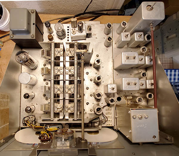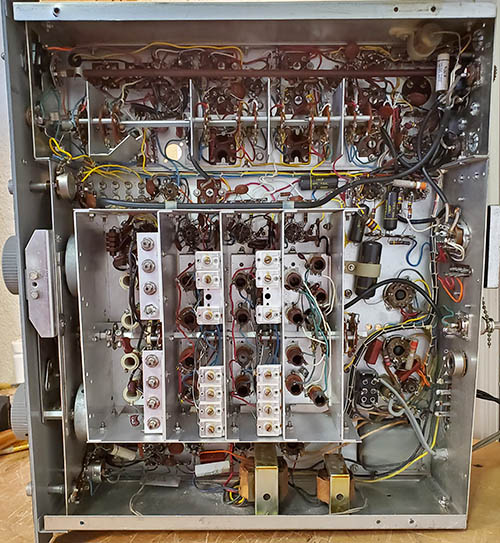 | Finding the NC-400 sn: 543 0006 - Sometimes things just come to you when you least expect it. That was the case with this NC-400. Back in August of 2017, I was casually looking around in the back room at Ham and Hi-Fi in Sparks, Nevada. On the bottom shelf of their long line of storage shelves I spotted an unusual receiver,...it was the first NC-400 I had ever seen "in person." I remember thinking "it doesn't look that ugly in person. In fact, it's kinda cool looking!" It was pretty dirty and one of the two tuning knobs was broken with a large section of it missing. Overall, it looked complete and original. A few days later I got a late-afternoon call from Don W7SSB, the tech at H&HF, telling me that the NC-400 blew fuses when trying to power it up and, if I wanted it as a "Tech Special," I could have it "as-is" for $100. I told Don I'd be over the next day to pick it up. A copy of the manual was included along with two NOS-boxed tuning knobs. | 2017 Problems - Bad Multi-Section Filter - The problem of "fuse blowing" was caused by a shorted filter capacitor (from what I've read that seems to be a common problem on NC-400s.) Luckily, no power transformer damage occurred. I "tack soldered" some electrolytic capacitors in as a "quickie test" to see if that stopped the fuse blowing and it did. I ordered an exact replacement multi-section from Antique Electronic Supply in Arizona. The 4H4-C was missing and a 6V6 substituted. This was "no problem." Also, the 6BZ7 tested "dead" - really, no emission at all, even though the heater was illuminated. I tried a recommended substitute tube for the 6BZ7 but found that tube wouldn't even function as an oscillator. I eventually performed a thorough search through the tube storage up in the loft out in the shop and found a few "NOS, in the box" 6BZ7 tubes. I guess the upshot would be to use only a 6BZ7 tube - no substitutes. The substitute would have only been for testing purposes anyway, but I couldn't even get the the substitute to oscillate, so no receiver operation. I replaced a few weak tubes and performed a full alignment (a couple of times on the highest frequency band.) The NC-400 seemed to work okay. I used it a few times but never put it into a station at that time. |