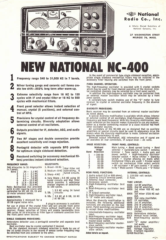 the NC-400 dealer flyer shown further down the page. NC-400 production estimates vary widely - from an incorrect low of around 200 receivers up to perhaps as high as 1000 receivers (highest NC-400 serial number I've personally seen was in the 600s.) Probably a lot less than ten percent of production went to the "well-to-do" hams and SWLs who could afford the "stratospheric" price. The remaining receivers were sold to commercial and government users. Among the more commonly mentioned government users was the FBI where the receivers were installed in some field offices for various purposes. There are reports that some NC-400 receivers were obtained in used condition from government sales mainly from the FBI. Certainly other government users and the commercial users found the NC-400 filled their requirements and the exorbitant price was paid either by tax-payer dollars or company requisition funds. Even my NC-400 profiled in this article was a "commercial receiver" originally owned and used by WHAS, a radio-tv station in Louisville, Kentucky. The NC-400 was advertised up to about 1963. |