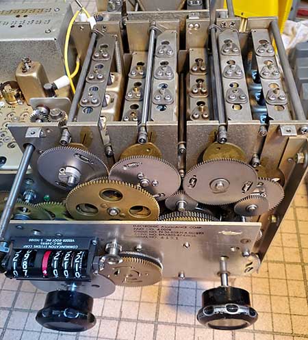 July 24 - 28, 2016 - Took RF deck outside for a WD-40 flush of the gear box. The Veeder-Root counter was very dirty and I thought the digits were damaged but, again, it was just the black dirt causing the problem. Luckily, it comes off easy with WD-40. Stripped down the RF deck by removing all 24 RF and VIF transformers, slug racks, return springs. With no load, the KC tuning was checked for "feel" which was normal. Same for MC tuning. Checked cam synchronization by setting tuning to 07+000 and found that the 4-8mc cam was way off. Probably why the 4-8mc RF coil was missing - a former owner was chasing a problem in the wrong area of the receiver (also noted that the mica capacitors had been replaced in remaining two 4-8mc RF transformers.) Mechanically reset the 4-8mc cam to correct position. Replaced the missing 4-8mc transformer and also replaced the remaining two that had been "worked on." All other cams were in alignment. Cleaned and inspected ALL 24 RF & VIF transformers checking for proper rotation of trimmer on each. The replacement 4-8mc RF coil needed to have the trimmers "unstuck" and repaired before it could be used. Cleaned all slugs of dust and any other dirt. Cleaned all slug racks and lubed cam rollers. Reassembled the RF deck, adjusted the fit of all slugs into their respective coil barrels and then checked operation of all of the cams, slug racks, slugs and cam rollers. |