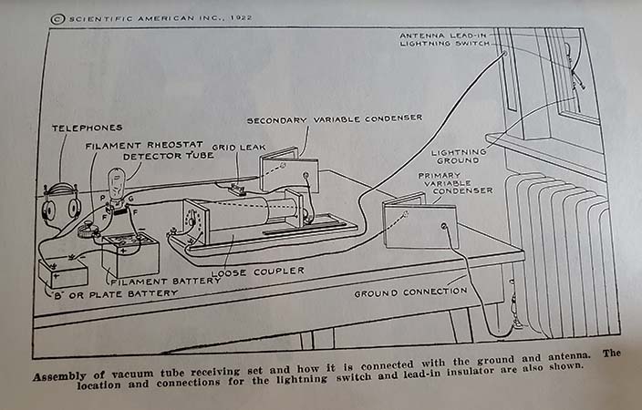 photo right: Page 155 of Morgan McMahon's "Vintage Radio" had this drawing showing the hook-up for a vacuum tube detector used with a loose coupler. The "book" condensers are interesting, too. NOTE that the copyright date is - 1922 - from Scientific American Inc. |