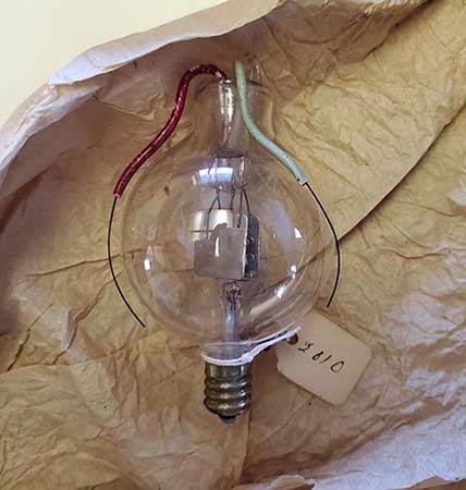 >>> I didn't do anything to the mahogany cabinet. It has always been in very good condition. Originally, there was a back panel that was hinge-mounted. The two brass hinges were still present but the back cover was "long gone" when I got the receiver. I never have built a replica back for the receiver since I really don't know what it looked like or even what material was used. If I was going to make a replica, I'd like to use 0.25" thick hard rubber (Condensite) if I could find it (and it wasn't warped). For displaying the SARX I built a spherical audion replica tube using an already broken Western Electric "tennis ball" tube. I glued the correct type of lamp base to the top tip of the envelope and then using epoxy I built up a bottom for the replica tube with the two wires exiting from that end. From a distance it's almost convincing,...but then,...why not look at the original DeForest Spherical Audion that follows? |