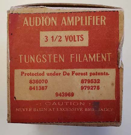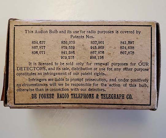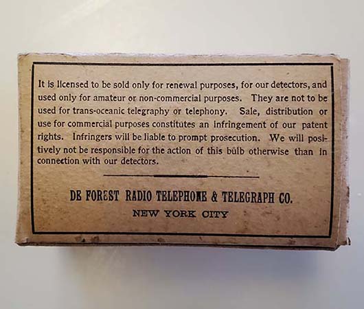 sales, distribution or use. The other side of the box is the warning about "commercial use" and also about trans-oceanic use. Also, the disclaimer that if the Audion is used in any equipment other than DeForest's that DeForest RT&T isn't responsible for its performance. |