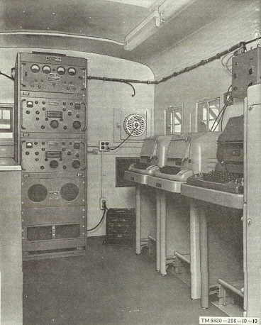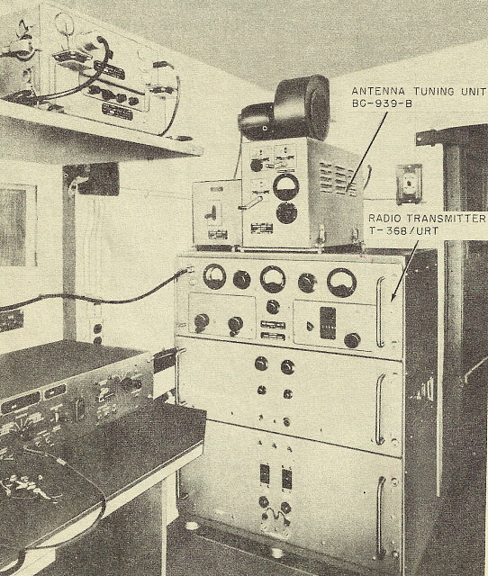 AN/GRC-26 Many (probably most) T-368s were used for RTTY communications and were installed in "huts" that were somewhat portable. The huts could be set-up in the field and powered by a trailer-mounted (portable,) gas-driven AC generator. The complete hut and its equipment were designated as AN/GRC-26. These huts were RTTY stations set-up for diversity reception of the incoming RTTY signals and featured two R-390 receivers running with the CV-116 Diversity RTTY Converter. The B&W artwork shown below left is of the AN/GRC-26D inside rear wall. The rack equipment (top to bottom) consists of the CV-116 Diversity RTTY Converter, R-390/URR receiver #1, R-390/URR receiver #2 and the LS-206 rack mount dual speaker. The TTY machines were TT-98 for receive only. The TT-76 was a reperforator-transmitter TTY machine for sending. The AN/GRC-26 also was equipped with the MD-239-GR which was the FSK transmitter modulator. The MD-239 was usually mounted on top of the T-368 next to the BC-939-B Antenna Tuner. The C-1123 was the control set that routed incoming signals from the CV-116 to the TTY machines. It also selected the proper equipment for transmitting the various modes. The hut was approximately seven feet wide by twelve feet long by about eight feet tall. It was usually mounted on a trailer and towed to field locations. Although RTTY was the primary mode of communications, AM could be used, although usually only in an emergency. Sometimes CW was used to establish communication and then the mode was quickly changed to RTTY. The GRC-26/T-368 set ups utilized the BC-939-B Antenna Tuner (TN-339/GR) which was essentially a gray-painted version of the tuner that was used with the BC-610 transmitter. The BC-939-B allowed the user to match either a whip antenna or perhaps a "long wire" antenna to the T-368's output. |