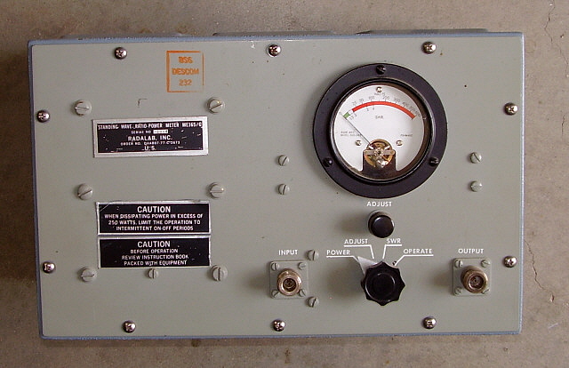 The SWR Bridge works like any of the older style bridges. With RF power going into the bridge, select ADJUST. Then use the ADJUST knob to set the meter to read full scale. Then switch to SWR and the meter will indicate the SWR. The switch also has a position for OPERATE that allows bypassing the bridge entirely. The POWER position switches in the dummy load and the meter will indicate the RF watts input to the dummy load. The input and output connectors are Type-N coaxial receptacles. The ME-165-G was usually mounted to the hut wall adjacent to the T-368. The ME-165-G was included in the equipment installed in the AN/GRC-26. Since there is an OPERATE position which bypasses the bridge, leaving the ME-165-G connected between the transmitter and antenna results in no losses in the OPERATE position. The ME-165-G shown in the photo to the right was built by Radalab, Inc. . |