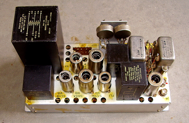 The are some variations in some of the Speech Amplifier modules. Early versions use RF choke coupling to the grids of the first audio amplifiers while later versions eliminate the chokes entirely and some very late versions use 10K resistors to couple to the grids. Component placement is critical in the Speech Amplifiers that have the RF choke inputs since the 1st Audio Amplifier tube's heater decoupling capacitors are very close to the RF chokes and can couple heater voltage (6.3vac) hum into the grids of the 1st Audio Amplifiers. Make sure there is ample separation between the decoupling caps and the RF chokes. photo right: The Speech Amplifier Module. The pots adjust the Clipper circuit. |