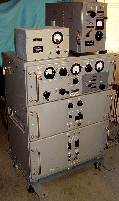 Circuit Details - The T-368 uses a modular unit called the Exciter that consists of a PTO (permeability-tuned oscillator,) a permeability-tuned Frequency Multiplier section and a permeability-tuned RF Output Section. A mechanical-digital Veeder-Root frequency readout is an integral part of the Multiplier/Exciter unit. The Exciter RF output tube is a type-6000 which provides sufficient power to drive the RF PA output tube which is a 4-400A. The output network is a Pi-L using Jennings vacuum variable capacitors for tuning and loading. The Speech Amplifier is module that is mounted on the Modulator chassis. The Speech Amplifier provides a dual input for either a Carbon mike or for a 600Z ohm audio line. The output of the Speech Amplifier is sufficient to drive the Modulator tubes, a pair of 4-125s. The power supply provides all of the required voltages and uses 3B28 rectifiers for the +HV and 5R4GWB rectifiers for the +LV. The cabinet contains the wiring harness and the Antenna Relay module along with the cabinet blower. There is also a smaller cooling fan for the 4-400 PA tube. The T-368 will transmit in AM voice, CW or FSK modes. It can also be used as an RF amplifier using an external low power exciter via the External Input. The transmitter is powered by 115vac at 20A, or around 2200 watts (peak) in the AM mode. For FSK RTTY operation, a proper FSK driver is necessary (MD-239/GR) and is connected to the FSK input on the front panel. Voice generally required the use of the M-29 (or similar) carbon microphone connected to the CARBON MIC input but this isn't the only way to voice modulate the transmitter. You can also run audio into the 600 OHM input via the rear Remote Input connector. Though intended for use with telephone line inputs, the 600 OHM input is almost exactly the same electronically as the CARBON MIC input with the exception that 600 OHM 1st Audio Amp has slightly higher gain than the CARBON MIC 1st Audio Amp circuit and there is no bias voltage or coupling capacitor in the input circuit. The disadvantage to using the 600 OHM input is that the mike cable must be routed to the back of the transmitter. Push-to-Talk is also available at the Remote Input. By using the 600 OHM input, a crystal or dynamic mike can be used although you will have to provide some sort of impedance matching. Usually the Astatic TUG-8 "amplified" stand will work fine into a 600Z ohm input with a variety of Astatic mike heads available. The BC-939 Antenna Tuner uses three roller inductors and two fixed-value vacuum capacitors to create three types of L or LC combinations for loading either a 15 foot to 20 foot vertical whip antenna or an ambiguously described (and never used) long wire antenna. The ME-165-G is a combination SWR bridge and watt meter/dummy load. The dummy load is rated for 200 watt continuous and up to 600 watts intermittently. The connections are via N-type coax receptacles. The normal location for the ME-165-G was mounted to the wall of the communications hut and to the left of the T-368. However, it can also be located on top of the T-368, as shown in the photo to the left. photo left: 1952 Barker & Williamson T-368/URT