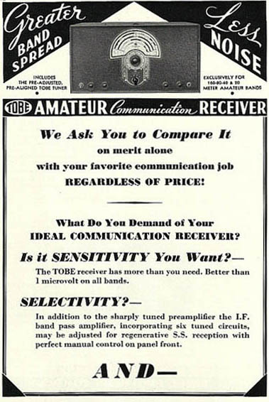 Ad for the TOBE Amateur Communication Receiver in the booklet "Around the World with the Browning 35" by Glenn Browning. |