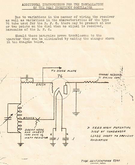 Selectivity - The ACR 35H has average selectivity. I measured it on 80M using a signal generator and tuning from center out each way until the signal couldn't be heard. I got 4kc each way indicating an 8kc band width at -20db. So, that's very close to the specs (in fact, slightly better since the specs indicate a 10kc bandwidth at -20db) so the Halli IF transformers set up for NARROW IF seem to work very well as substitutes for the TOBE tertiary winding types of IF transformers. The BFO can be set slightly higher or lower than "zero beat" with the IF to achieve better CW selectivity. Also, a higher beat note of 800hz to 1000hz helps CW copy. Also, there's the "regenerative IF" option that Browning suggests. Stability - The TOBE SPECIAL is very stable and that's probably due to the 2A Tuner and the air trimmers in the LO section. The ACR 35H has good stability in the AM mode and drift isn't really noticed. But, it's not really very stable in CW/SSB. There are random slight frequency changes that are only noticeable in CW/SSB and are most noticeable on 20M. Although the BFO is almost certainly the cause, the 35H Tuner in this ACR-35H receiver doesn't look like it was built very well. Most of the sloppy solder joints are just barely above "tack joints." It's very difficult to believe that it came from Toby Deutschmann that way. So, CW/SSB stability is good on the lower bands but 20M is most affected with occasional minor frequency excursions of a few hz. But, further testing revealed that a fairly long "warm-up" improves the stability. As the receiver was used more and more this stability problem settled down and eventually went away. Probably switching, tuning and using the receiver helped to eliminate contact problems and improved stability. BFO Mod - Another observation was that the BFO harmonics are tuned in around 7.2mc. It's a pretty strong and noticeable signal. Browning suggests that if the BFO harmonics are a problem that the user should install a 1K resistor between the cathode of the BFO tube and the BFO coil tap, change the BFO plate load from 50K to 500K and add two 0.1uf filament bypass capacitors. Full mod shown to the right. As the description mentions, receiver wiring and the type of 76 tube are factors in this potential problem. The TOBE SPECIAL, with metal octal tubes and a 6C5 as the BFO tube, doesn't have this problem but the ACR-35H, with the type 76 glass tube, does. At the time period of this mod, the only reason for the BFO was to demodulate CW and the BFO injection is usually kept quite low to keep the BFO from "masking" weak CW signals. Nowadays, we want to listen to SSB signals that require quite a high level of BFO injection for reasonable demodulation. It's possible by increasing the plate load resistor by a factor of ten the resulting BFO level might be quite low,...perhaps okay for CW but it might be a real problem for modern SSB that's already challenged by the non-adjustable "max" RF gain when in the CW/SSB mode. |