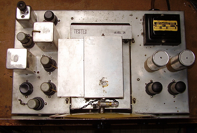The IF gain control was directly in the IF amplifier tube's cathode to ground circuit and determined the IF tube's gain by its grid bias relative to the adjustable cathode potential above ground. Both the RF amplifier gain and the IF amplifier gain were controlled by the AVC bias voltage when the receiver was operated in the AM mode. If reception of a CW signal was desired, then the BFO was switched on,...and that same switch also turns off the AVC. The AVC switch grounds the grid bias line on the RF amplifier and, with a 400 ohm cathode resistor for "self bias," the RF amplifier stage runs at maximum gain. In this CW/SSB mode, the entire receiver sensitivity is controlled solely by the IF tube cathode self-bias. This was to achieve a high level of sensitivity and, in the 1930s, with low noise levels, much less powerful signals and simple antenna systems, the IF gain control was probably able to keep the CW signals from over-loading. Nowadays, it's difficult to operate a TOBE in the CW (or SSB) mode unless certain precautions are taken such as smaller antennas or signal attenuators to reduce the level of extremely strong signals that will over drive the IF section of the receiver, even with the IF gain at minimum (more on this problem in "No Receiver is Perfect" further down in the TOBE SPECIAL restoration section.) The Browning 35 employed seven, glass, large-pin base tubes. The builder could select 6.3 volt filament tubes or 2.5 volt filament tubes. At the time there was a controversy regarding the 6D6 used for RF and IF amplifiers that sometimes had their gain controlled by AVC. It was thought by some engineers, foremost being James Millen of National Company, that the six volt tubes added modulated AC hum to the higher frequency signals. National also offered their HRO receiver in both 2 volt or 6 volt versions (they were the same circuit other than the tubes and the power supply provided) up until early 1939. So, Browning also offered the builder the option of using 2 volt tubes or 6 volt tubes. A dual filament winding on the power transformer provided the voltages needed. The builder could choose either 2.5vac tubes - (2) 58, (1) 2A7, (1) 2A6, (1) 56, (1) 2A5, (1) 80 (5 volt filament rectifier.) Or, using 6.3vac tubes the line-up was (2) 6D6, (1) 6A7, (1) 75, (1) 76, (1) 42, (1) 80 (5 volt filament rectifier.) The Detector used a duplex diode-triode tube for the glass tube versions. Later, when the metal octal tube version was available, the Detector was a separate 6H6 dual diode tube and the 1st Audio amplifier was a triode 6F5 metal octal tube. >>> |