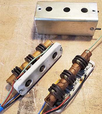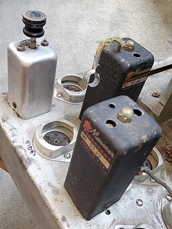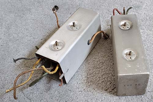 Oct 26, 2023 - For testing the tertiary trimmer C in T2 I disconnected the coil from the trimmer. I then connected C-tester which indicated 80pf. I adjusted the trimmer down to <50pf and up to 125pf, so it does work correctly. I reset the trimmer to 80pf. I installed NOS cloth-covered with correct color codes (stranded wire inside) to replace the incorrect wires on T1. Also, to replace the darkened original wires on T2 (the wires were the correct color code but after 88 years they all appeared to be black or dark brown.) Cleaned the IF shield-cans to remove some sort of amber discoloration (smoke, tar, nicotine?) The cleaning allowed the TOBE logo to just be visible on T1. T1 had a non-original hole in the top of the IF shield-can that had been for an added ground lug for a shielded grid wire (a mod.) I used epoxy to fill the hole and then colored the epoxy silver to match the shield-can. I installed the IF transformer assemblies into their proper shield-can to complete the check-out, new wire installation and cleaning. These IF transformers are now ready to install into the TOBE ACR-35H receiver. |