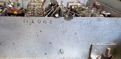 Two views of the TOBE ACR-35H SN: B1062 showing the original type TOBE tertiary IF transformers now installed. Installing the Halli IF transformers got this receiver working fairly well and looking much better than it had looked when found. But finding and installing the correct TOBE Tertiary IF transformers has made this TOBE into a NEW receiver with dramatically improved performance. Even the chassis appearance, though still "spotty" and having two hole plugs, is now looking close to original. If I ever run across an original deluxe dial escutcheon, I'd have to do a new black wrinkle paint job on the front panel. And, maybe the next Browning 35 I find won't be a "junker." |