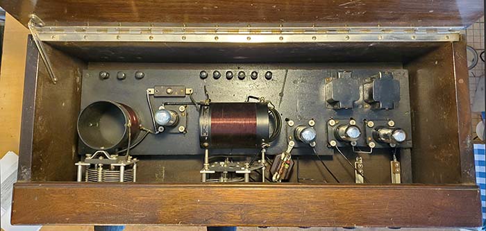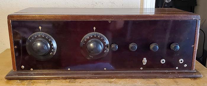| The example shown is an early Regenaformer kit incorporated into a complete receiver. The cabinet is commercially-built, purchased piece. The mahogany formica panel was purchased and fits the cabinet correctly. The panel was drilled by the kit builder and shows an amateur level of workmanship. The chassis is made of poplar wood painted black. I believe that the builder had some plans to follow since the layout is very good. The builder used BradleyStat compression variable resistance controls for the filament adjustments and these three variable R controls operate fine. The ON-OFF toggle switch unfortunately was defective (a shunt was installed across the switch.) Originally, the radio used Lyric-Rauland S-500 interstage transformers but the extreme weight of these transformers and the total lack of packing inside the radio allowed the Raulands to break loose from their mounting (wood screws in soft wood) and hurl around inside the cabinet doing extensive damage to the chassis, breaking all four tubes and breaking the front side edges of the cabinet during the shipping process that went from Connecticut to Nevada. For the rebuild, one of the Raulands was open and I didn't have a matching replacement (I did have a Rauland somewhere around here, but I couldn't find it.) I decided to rebuild the entire receiver, repairing the damage to the Regenaformer coil (mostly bent coil windings that had to be straightened and then reseated into their grooves) and installing two matching Thordarson interstage transformers. Since the Rauland connections were on top of the chassis and the Thordarson connections are under the chassis the rebuild in the audio section was extensive (I had to fill all of the original holes with wood filler and repaint. Then drill new holes.) Since the new connections were under the chassis, the rewiring was fairly extensive but I used vintage lacquer sleeving and 16 gauge buss wire to have the rework look authentic. Incidentally, the seller felt very badly about the shipping damage due to lack of packing correctly and issued a "full refund" - not that the radio was very expensive, it wasn't - but it was the thought that counted. |
