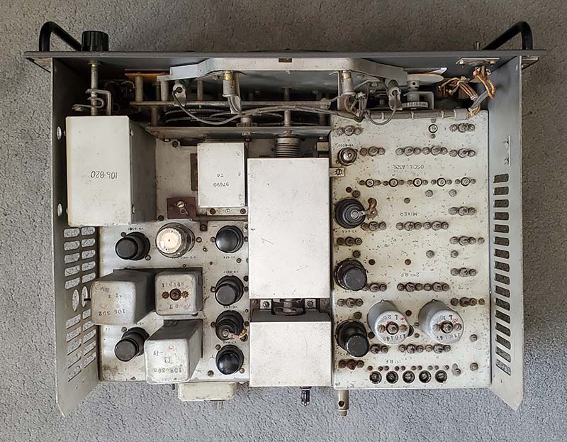 and tune for peak. Then adjust the Cal slug for zero beat. RF Tracking Alignment - RF alignment per the manual uses the logging dial scales for frequency settings. This assumes that the receiver was going to have an accurate conversion table that provided the radio op with the settings for specific frequencies. The manual does caution that the slide rule dial isn't all that accurate. However, most modern users aren't going to create a logging dial to frequency conversion table except for just a few stations or net frequencies. Therefore, I just used the slide rule dial as a reference and adjusted for reasonable tracking accuracy. The top end of the band capacitive trimmers are cylinder-types and adjust very easily. The low end adjustment are the lubricated slugs. It's very easy to align the front end since each coil is clearly identified in the manual drawings. That's how I did this "quickie" alignment. I did another more accurate RF tracking alignment in late October and used the manual procedure that utilizes the logging dial for extreme accuracy. Details further down this write-up in "Workbench Revisit." |