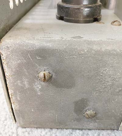 I checked the "problem C123" location since this receiver was a CSR-5 with a serial number lower than 816. C123 was entirely missing. It's not a critical component but it should be present to take care of high frequency transients and protect the output transformer primary. Also noted were two of the connections to T4 (output xmfr) weren't soldered and several others were "tack soldered" connections. All connections to T4 were completely redone. I checked over all of the "new" solder joints under the chassis and corrected those that looked questionable. The RF Gain control connection to chassis needed to be redone. I shunted the "re-radiation resistor" in the antenna connection (it had been changed from original 1K to a 10 ohm carbon composition resistor, but I shunted it anyway.) That pretty much took care of the electro-mechanical rework. Cosmetically, K6DGH had mounted the CSR-5 data plate on the front panel. It should have been mounted to the top lid of the cabinet (as originally done.) The data plate was installed on the front panel with drive pins which required using a C-clamp and spacer to push the pins out of the panel. I remounted the data plate to the cabinet lid (original holes with screws and nuts hardware already present.) The non-original holes in the front panel were filled with epoxy and then touched-up with custom matched paint. It's worth noting that the data plate, while for a CSR-5 Type 110930Z, is SN:682, yet stamped on each side and on the rear chassis apron of the receiver is "394" which I assume is the actual serial number. Cabinet swapping during RCN depot repair might account for the discrepancy but a later collector "parts swapping" is more believable. That would be that the data plate isn't original to the receiver and cabinet. At any rate, I consider "394" as the actual serial number of this CSR-5. All of the front panel screws were fairly new but non-original type, black phillips head screws. The original screws used were round head slotted machine screws. I replaced all of the screws with the correct types. I wanted to set up the CSR-5 with the shock mounts. I found a set of shock mount feet (Barry mounts) on eBay and purchased the 1"x 1" mild steel angle locally. The angle brackets were built and then painted wrinkle finish using VHT Gray Wrinkle Finish. The VHT Gray has a lot of brown in the mix and it was a close match,...well, maybe one shade more towards gray but close enough. I've set CSR-5 SN:394 up as the station receiver with an ART-13A transmitter. Maybe not an original combination but both pieces are WWII veterans and work together nicely. photo right: Serial number "394" stamped into chassis's rear left-side |