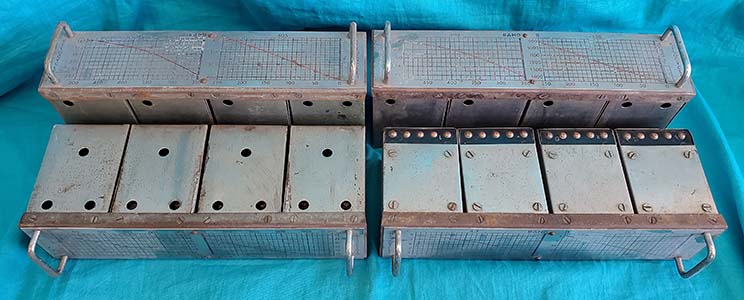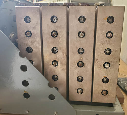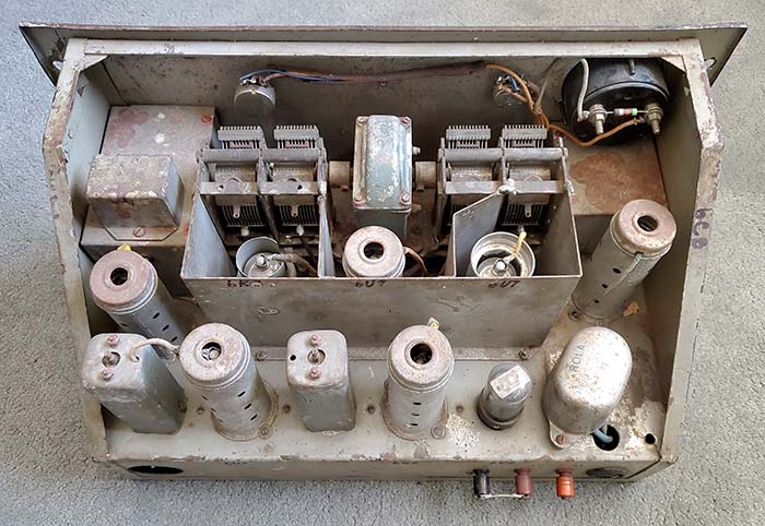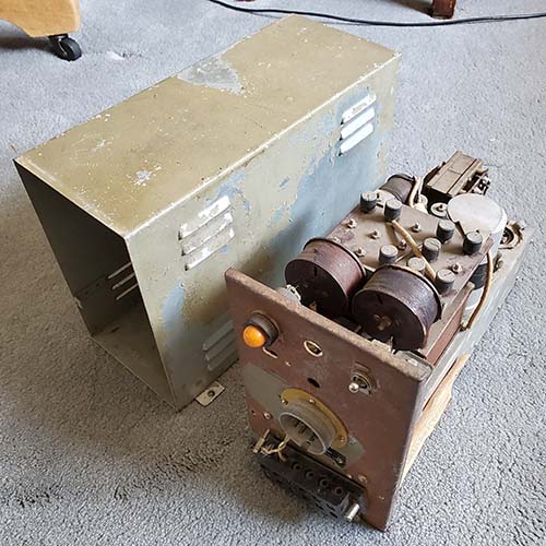 | More Rework and Testing - Once the 889 was rewired it was given a "clip lead" test to see if everything functioned before the cosmetic work was started. As mentioned above, as wired and operated on 120vac, the output voltages were too high with the B+ running about +330vdc (should be +250vdc) and the heater voltage running about 33vac (should be 25vac.) Different taps on the transformer primary were measured for DCR and the next closest tap was tested but provided too low of voltages for output. However, when the power transformer was connected per the schematic for 230vac operation and that voltage level used as the input power, the output voltages were correct as specified in the manual at +250vdc for the B+ and 25vac for the tube heater supply. The only solution is to operate the C.R. 300 via the 889 on 230vac input, as designed. I have 230vac available out in the shop but not in the upstairs ham shack so I have to use a "step-up transformer" to have a 230vac power source available upstairs. Using the step-up transformer (which actually has an output of 244vac since our line is 122vac) produced +263vdc with a 65mA load for the B+. The tube heater supply was 25.9vac with no load and the pilot lamp was operating on 6.1vac. All voltages were pretty close to specs. | Cosmetics - The front panel and the cabinet both required a total repaint. Additionally, the front panel had several non-original holes that had been hacked in over the years. I was a little hesitant to strip the front panel paint because of the silk screened nomenclature but about 80% of the silk screening was already missing because of the rust so stripping the remaining paint didn't do that much damage. Fortunately, the Marconi tag was in good shape and removable. The non-original panel holes were filled with epoxy. Paint used was a Rustoleum product called "Granite Satin" which is pretty close to Marconi gray (just slightly darker.) I had to use a standard USN-style, WWII vintage fuse holder (didn't have anything like the original that was entirely missing.) I also had to use a different type of terminal block since the original one had a broken mounting flange (in fact, the terminal block used is gray rather than black.) The voltage input terminals on the block are now changed to just the 230vac input with Line-Line-Ground connections. The remaining three terminals provide monitoring access for the two lines for tube heaters and for the B+ line. When measuring the voltage outputs, for a correct reading, the receiver has to connected and operating to provide a load on the output voltages and to also provide the ground connection for the B minus line. Before painting the front panel, I metal-stamped "240 - 240 - 0 - 25 - 25 - 260" above the terminals to identify the voltage inputs with the left three being, L - L - G for 240vac input and the right three being Htr - Htr - B+ monitoring outputs. I also repositioned the Marconi data plate to be more visible above the power output connector. I also had to fabricate the bent metal piece that covers the terminal strip inputs. Reassembly completed Oct. 4, 2020. |