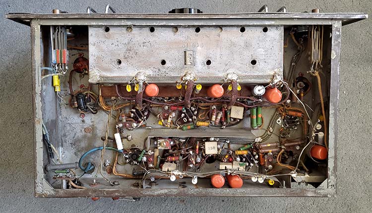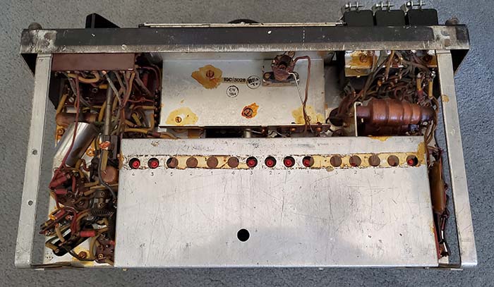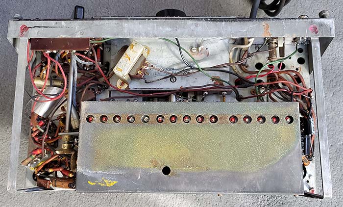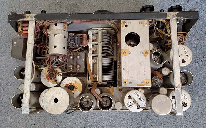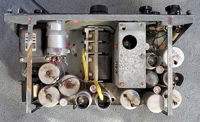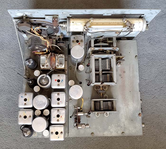 The Mod Rundown,... 1. Removal of all DF circuitry, wiring and components - All DF controls removed. Much of the hardware was also removed and discarded. Most original knobs gone. 2. Antenna input - This is a brown bakelite binding post terminal-type that was "hacked" into the upper right side of the panel. 3. MS (Master Switch) Relocation - Of note is the vacant MS area. The switch was moved to allow the installation of the power transformer which is located directly behind the panel where the switch had been. The MS was moved to the METER BALANCE (pot control removed) location (upper left side of the panel) and only two positions were wired - AVC and Manual Gain with BFO on. 4. Power Input Changes and Electrodynamic Speaker Intentions - The Jones connectors were entirely removed and an aluminum plate installed. The four pin tube socket had been intended for an electrodynamic speaker with the field coil doubling as the power supply filter choke. The AC power ON switch is the only original type R1155 toggle switch. SN:68154 was modified in Canada so the power transformer used for the AC power supply was a 115vac primary type built by Hammond. AC power cord exits out the front of the panel. 5. Lo-Z Audio Output with a Boost - With the VR102 dual triode R-L meter driver removed, a 6F6 audio output stage had been added at that location. A Lo-Z audio output transformer was added after the original Hi-Z audio transformer had been removed. 6. Logging Scale - The Fine Tuning logging scale was removed sometime in the past. 7. Cabinet Destruction - Two one inch diameter holes were punched in the top of the cabinet. Nine one inch diameter holes were punched in the right side of the cabinet. A common hamster thought fallacy that the onboard an AC power supply and a high power audio section would get so hot that complete cabinet ventilation was going to be necessary. |