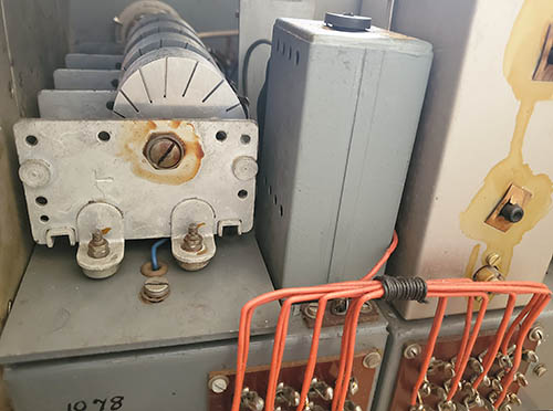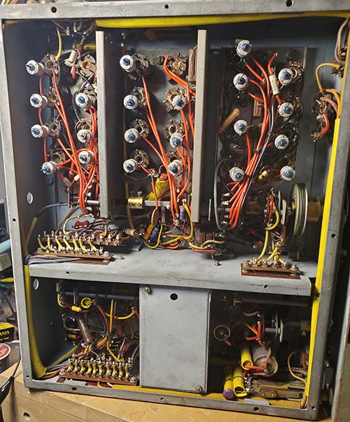 Re-Restoration - I obtained CSR-5 SN:394 around 2010 from fellow ham and collector NU6AM. The receiver had been cosmetically restored earlier by K6DGH, who had had the cabinet and panel powder-coated in a brownish-gray color that was substantially darker than the beige wrinkle that has been found on many CSR-5 receivers. NU6AM, Jim, had obtained the receiver in "unfinished" condition and needing some electronic work. Jim did a "re-cap" job that was not particularly sympathetic using "yellow jackets" and IC electrolytics. I believe that Jim wasn't too impressed with the finished CSR-5 performance and that's why he eventually sold it to me. At that time, I repainted the dial escutcheon black wrinkle finish because it had been flat black with white rub-on "block" letters that weren't original (and were obviously an amateur application.) I also made new cables for the power supply to receiver hook-up since the cables that had been used were made from very small gauge wires that didn't look sufficient to provide the power supply connections without a substantial voltage drop. I didn't do anything else to the receiver except use it for a short time and then put it on display in the Western Historic Radio Museum in Virginia City, Nevada. Fast-forward to 2020,...I had closed WHRM in 2012 and moved to Dayton, Nevada. The CSR-5 had been stored from the past seven and a half years in my "cool room" in the shop in Dayton (a well-insulated storage room where the temp extremes are from 30F to maybe 75F.) I had just recently gone through a Marconi R1155 and its impressive multi-colored arc'd dial got me interested in that large multi-colored dial on the Canadian Marconi receiver. I had to extract it from the "cool room" and bring it to the upstairs radio repair location to take a better look at it and reacquaint myself with how it performed. The CSR-5 still worked as it had,...okay, but seeming like it could do much better. The tubes tested okay but the band switch was very erratic and needed cleaning with DeOxit and a small brush. All controls were given the DeOxit treatment. The split-gears in the tuning gear box were stuck together so a flush with WD-40 loosened them and that eliminated the backlash. The BFO and NL toggle switches seemed non-functional but a "spray down the barrel" with DeOxit cleared up the internal oxidation that was causing the problem. I was sure that neither of the former owners had performed an alignment. If a full IF/RF alignment hasn't been performed, doing one will certainly improve performance significantly. The IF adjustments and RF L adjustments all have lock-nuts so be sure to loosen when adjusting and snug-up when finished (while watching the output meter to verify that the adjustment doesn't change with lock-nut tightening.) With this CSR-5, all of the alignment adjustments were far enough out that quite a bit of improvement was gained by the procedure, especially the tracking which now easily meets the 0.5% accuracy tolerance specification. |