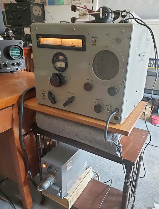 remote connections.) There was some minor damage to the cable shield at one end where the shield had be cut which completely isolated that additional route for interconnecting chassis-ground between the receiver and the power supply. I had to repair the cracked insulation on two internal wires. Then wrap the wire bundle with a single layer of friction tape and then a single layer of electrician's tape. Next, a split section of RG-8U jacket was fitted over the wire bundle and then a short section of shield that was removed from some junk RG-8U was split and then fitted to make a shield "patch." The shield was soldered to each cut end of the original shield to form a continuous connection. Additionally, the connector has a tapered clamp the fits over the shield and provides a positive shield-to-connector contact. The patch was wrapped with electrician's tape to complete the repair. Power ON Test - Before connecting the 889 to the receiver, the cable was tested for continuity and for shorts. The cable connectors are identical so it doesn't matter in which direction the cable is connected to either the 889 or the receiver. Since everything had been pre-tested individually in advance, the C.R. 300-1 powered up with no issues. The measured voltages with the receiver operating and the voltages measured at the receiver were +270vdc for the B+ and 23.5vac for the tube heaters, both within spec. The receiver operated the same as it had before when running on the Lambda and the AC transformer. I half expected some sort of noise from the 0Z4 tube but the receiver's audio was normal. I checked reception from 10mc down to 19kc (MSK station HOLT-NWC) with no problems encountered. Photo right shows the 889 after rebuild. Oct 5, 2020 |