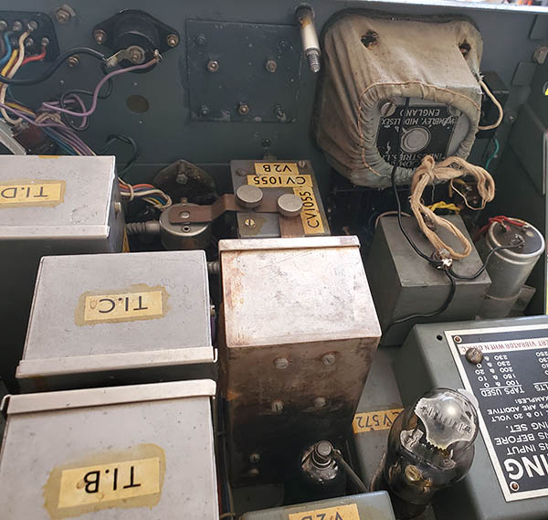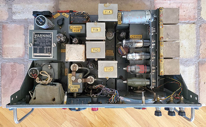The "A" in R1155A indicates that MW filters are installed to eliminate broadcasting interference at the IF (560kc.) "B" indicated the receiver had additional filters for operating near radar systems. There were several designated internal options available running up to a "N" version. Most variations indicate SW (radar filters) and/or MW (AM-BC filters) internal filtering, construction material (aluminum or steel) and in some cases end use. Some versions were for mobile-land use, some were used in ground schools and there were two types for marine use (air-sea search-rescue aircraft.) There were several types of 230vac 50cps power supplies available for land use. Some R1155 receivers were built on steel chassis with steel front panels and steel shielding. These were undoubtedly for ground use or installations other than airborne - the steel receivers are noticeably much heavier than the aluminum receivers. Most receiver cabinets have five cork panels glued to the inside recessed areas. The rear inside cork panel has the vacuum tube locations and tube types shown on a glued-on paper label. |