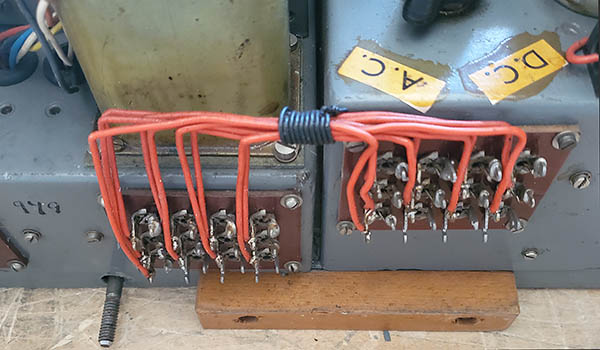 Electrical Inspection - I noted that the 5Y3 (a modification) filament was connected to the same power transformer winding as the pilot lamp. That should have proved exciting if the lamp was ever changed with the power on. It was necessary to isolate most of the circuitry from the power transformer and to apply voltage to the primary of the transformer to test the which windings were going to be required. Most of the windings that were for DC operation from the vibrator had been cut, so only the AC operation windings were connected. I used a variac to apply a controlled input AC voltage level. My first connection was per the schematic and resulted in the correct secondary voltages if operation was going to be on 240vac input. I noted that the actual modified wired connections for AC input were connected to different taps on the primary than original (per the schematic.) I applied AC voltage at these connections and the resulting secondary voltages appeared to be somewhat correct with 120vac input. That's not too surprising since the receiver did come from Canada. Some pseudo-technician in the past had utilized other taps on the power transformer primary winding that were originally for DC inputs via the vibrator that now weren't being used (probably the 110vdc input.) These connections worked out for the primary to have almost the correct ratio to the secondary windings for proper voltage outputs, however, the actual voltages with 120vac input were about 30% higher than specified. Other components tested were the plug-in triple filter capacitor that tested good. The chokes tested good. The four 2uf oil-filled caps checked good. What wasn't correct was the 5Y3 filament operating on the pilot lamp winding. If operated in this manner, there's no isolation of the B+ on the 5Y3 filament winding and B+ would be floating on the pilot lamp to chassis. A better choice would be to go back to the original 0Z4 rectifier. Reworking the AC Power Supply - The solder used didn't look like SnPb (real tin-lead solder.) Either the solder was defective (some amalgam that didn't flow correctly) or the soldering iron used was too cold. In any event, the soldering for the modifications was a very poor quality with several being "cold solder joints." The same wire type was used for all of the modifications. Since nearly all of the wiring was so poorly done, I stripped out the AC portion of the chassis and started over. I used mostly NOS vintage stranded wire for the rework. I had to repair the wires from the power transformer to the rectifier plates (HV) and also the wires to the rectifier pins 2 and 7 which aren't tube connections but are tie-points for the pilot lamp wiring (as original.) Pins 2 and 7 aren't used because I wired the power supply back to using a 0Z4 cold-cathode rectifier. That way the winding only operates the pilot lamp (as original.) |