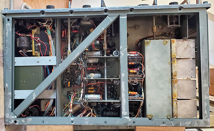 Performance - Overall, the CSR-5 is a good performer that is fully capable of operating as a station receiver in an amateur vintage military radio set up. The receiver is robustly-built and that provides excellent stability which is helped by the VR tube and filament loads on the LO and BFO tubes resulting in very little drift after a short warm-up. Sensitivity is competitive, especially if the receiver has been "gone through" and has had a complete IF/RF alignment and is used with a full-size, resonant (or tuned) antenna. Selectivity is very good if the crystal filter is operating correctly. It's a minor negative point that there's no front panel Phasing control for the crystal filter. The IF alignment instructions have C-64, the phasing trimmer, set to minimum bandwidth which is generally the desired function for a Crystal Filter. On the down side, the dial resolution is pretty vague, especially on SW. This is due to the wide frequency coverage of each tuning range and is typical (and expected) of any WWII vintage receiver. The logging dial and logging scale on the dial will provide an accurate method of frequency resetability. I'm using an eight inch Jensen speaker mounted in a Northern Electric loudspeaker housing that matches the CSR-5 quite well. To match the 10K output impedance, I'm using a 8K ohm to 8 ohm matching transformer spare that originally was for the Signal Corps LS-3 loudspeaker. T-R function is accomplished using the Send-Rec "AC receptacle" on the back of the chassis apron (or using the SEND-REC toggle switch on the front panel) utilizing the remote standby contacts on the T-R relay inside the ART-13 transmitter. The ART-13 also has a vacuum receive antenna switch for receiver isolation during transmit. The CSR-5 is a "heavy-weight" and when installed in the cabinet with the shock mounts weight is up around 75 pounds. Then add the VP-3 power supply at about 25 pounds (my cables are long enough so the VP-3 sets on the floor.) Update - Oct. 12, 2020 - I've been using the CSR-5 in combination with the ART-13A for a few of months now. It has proven to be one of my favorite WWII receivers to use. I've found it to be sensitive enough for 100% solid copy on all military radio net operations on 75M. Selectivity is good enough for dealing with adjacent frequency activity on all occasions. Audio quality is good and allows for excellent voice reproduction. I use the logging dial for accurate frequency reset. Minor points might be the AVC action which has a very slow "release time" which for CW is fine but for Voice could be a bit faster - very minor. Also, no antenna trimmer on the front panel (matched to the antenna during alignment.) A great receiver to use with fabulous bench presence. |
