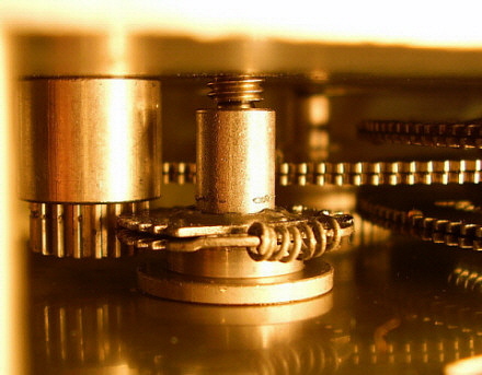 photo left: "Version One" (V-1) of the gear box showing the full 360º split-gear that drives the main tuning dial. Note that the split-gear is mounted to the hub of the tuning condenser drive gear which appears to take up most of the lower part of the photo and is fairly reflective. The split-gear engages a gear that is mounted on the end of the shaft that drives the main tuning dial. Also, note that the anti-backlash spring is a loop type coupling the two split-gears (not visible in the photo - the upper gear is slotted to allow the spring-end to be moveable.) photo right: "Version Two" (V-2) of the gear box showing the 270º split gear that is not as robust and prone to failure. Note that these split gears are coupled using a coil spring type of anti-backlash arrangement. It can be seen that the split-gear is not as closely coupled and this may account for its tendency to break some of the gear teeth. |