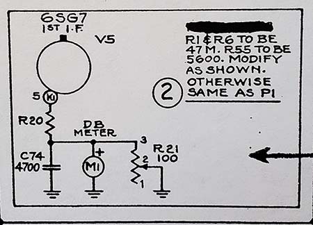 R20 shown is the already present 100 ohm Cathode resistor on V5 connected to pin 5 (shown as K1 because there are two pins connected to the Cathode and the Suppressor grid in the 6SG7.) Resistors R1 and R6 are in the receiver and must be changed. They are the Screen load resistors for the RF1 and RF2 amplifier tubes. They are changed from 33K to 47K. R55 is the series IR resistor for the RF Gain pot and that is changed from a 6800 ohm resistor to a 5600 ohm resistor. Components added are C74 4700pf (across the meter terminals,) M1 - the meter as described above and R21 - the 100 ohm pot - also described above. As can be seen in the schematic, the CL meter is measuring cathode current of the 1st IF amplifier tube. When in AVC, the signal strength will determine the AVC voltage which in turn determines the grid bias of each AVC controlled stage within the receiver. Strong signals increase the negative AVC bias voltage which reduces V5's cathode current and reduces the CL meter deflection and moves the meter needle to the right which indicates a stronger signal. |