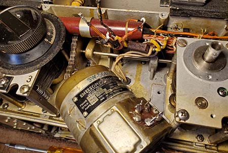 To remove the old motor, first dismount the locking bar, knob and back plate from Control A. This allows better access to the motor wiring and mounting screws. The wiring consists of four terminals, F1 and F2 (the field coil terminals) along with A1 and A2 (the armature winding terminals.) F1 has only one wire soldered to it but F2 has three wires and two capacitor leads installed. A1 and A2 have one wire each plus one lead from each of the bypass capacitors connected. These must all be unsoldered from the terminals. Be sure to mark the wires for proper reconnection. The bypass capacitors also have other wires soldered to their leads so they can't be totally removed, just disconnected from the motor terminals (be sure to mark caps for correct reconnection, the wires on the caps are routed through the chassis for motor direction control.) Once the wires and capacitors are off the terminals, then the motor mounting screws can be removed (four screws, usually.) The motor can be moved back on the left side and out on the right side to allow derailing the chain. Now the motor can be removed. Sometimes the left-rear screw won't be installed. Some repair techs didn't want to do the extra work to install this screw so it might be found missing. Although the ART-13 isn't airborne anymore, this screw should still be installed (it's not that difficult to do.) Installing the replacement motor will require placing the motor in the motor-bay at an angle with the left side going in first so the chain can be placed back on the motor sprocket. Then mount the chain to the motor sprocket. Next, thread-in the three mounting screws leaving out the left-rear screw. Make sure the chain is properly engaged in the sprockets and make sure that the chain tension has some slack - it should be somewhat moveable to allow access to the left-rear screw hole. Using long needle nose pliers insert the remaining screw in position and thread it in using a long thin screw driver (working past the chain) but don't tighten yet. Position the motor for slightly loose chain tension and then tighten the four screws. Then, the wires and capacitors are soldered back to the correct terminals. NOTE: The motor I installed had "barrel terminals" that required making a securing loop out of 16ga TC to clamp the wires before soldering. When completed, double-check the screws, the chain tension and the wiring. Lube as necessary (use minimal amount of lube.) With +28vdc connected just to pin 4 of U7 and -28vdc/ground connected to pin 5, switch on the +28vdc and the motor should run until the Autotune cycle is complete (don't switch ON the transmitter - motor power is directly connected.) Select another channel and allow the Autotune cycle to complete. Check the current draw, it should be about 2 amps just running the motor and about 5 amps total on the +28vdc line connected to pin 4 of U7 when fully assembled. Install the back plate, the knob and locking bar for control A. Reinstall the bottom cover and the lower front cover. Total current of the completely assembled and operational ART-13 will be about 8 amps on the +28vdc line and just a little over 10 amps when running the Autotune. |