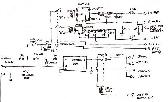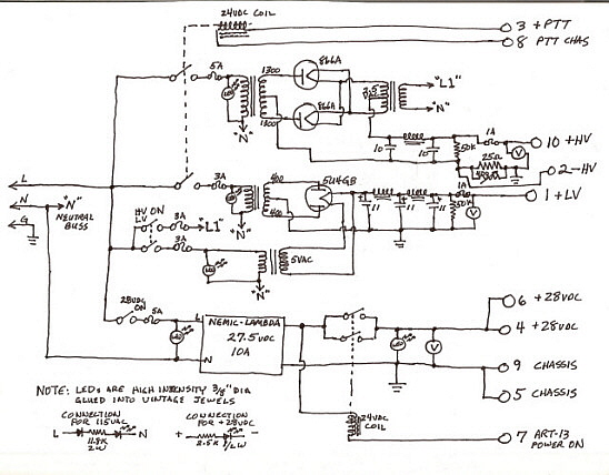 U/7 plug. I decided that since 866A MV tubes were going to be used I should have a "viewing port" to watch the "blue glow" of the tubes. Full metering was also provided only because I happened to find a matching set of three meters in one of the junk boxes. A 5U4GB has to be used for the +400vdc due to that tube's rating being at a high enough current and operating voltage for that application. Since tube rectifiers were used, I provided the filament voltages with separate filament transformers. This allowed the tube rectifier filaments to be "on" at all times but to use the PTT from the ART-13 to apply the +HV and the +LV via the power transformers to the rectifier plates. This simulates the operation of the dynamotor starting up with actuation of the ART-13's PTT. +1400vdc - Relatively small plate transformer salvaged from old homebrew 813 transmitter. 866A MV rectifiers utilizing a 2.5vac 10A filament transformer. Pi-filtered. Oil filled filters 10uf 2000vdc rating. Changed to choke input filtering. +HV now +1050vdc. 1-10-20. Details below in "UPDATE Jan 10, 2020." +400vdc - Power transformer from homebrew audio amplifier. 5U4GB rectifier. Dual section filter. Filter caps are 22uf 450vdc in series providing 11uf 900vdc rating. Changed to pi-filter. +LV now +420vdc. 1-10-20. +28vdc - Nemic-Lambda "Model PS-14-24" that provides +27.5vdc rated at 10Amps (peak rating is 20A,) a small switching power supply of modern design. Actually this power supply is a 24vdc power supply and is adjusted up to +27.5vdc using the voltage adjustment pot provided on the rear chassis of the unit. 40mv of ripple regardless of load. RF quiet. Even so, all output wires must be shielded for RFI quite operation. Relays - Two 28vdc relays for ART-13 power ON and PTT function. Fuses - Fully fused on all inputs and outputs Pilot Lamps - High intensity clear LEDs provide illumination inside vintage "jewels." These LEDs were purchased at Radio Shack. When operating these LEDs on AC, a diode will be needed along with the appropriate load resistor. As seen below in the photo, the red and yellow lamps only illuminate when the power supply is providing +HV and +LV to the ART-13. The blue lamp indicates that the ART-13 is "ON" and ready to use. The left green lamp indicates that AC is applied to the +HV/+LV section and the rectifier filaments are powered. The right green lamp indicates that the +28vdc supply is "ON." Meters - The +HV and +LV meters only indicate voltage when the ART-13 is in operation. The +28vdc meter indicates that voltage as supplied to the ART-13 and is in continuous operation while the power supply is "ON." Plate Current Meter Shunt - I used a 400 ohm 25W Wire Wound potentiometer that had a 25 ohm 25 watt WW resistor in parallel with it. This allows easy adjustment to 1X, 1.5X or 2X of FS reading on the Plate Current meter. The excessive dissipation of the shunt is just a safety factor since this is the only path for -HV to chassis. Failure of this shunt would allow full -HV current to flow through the meter (which is not good.) Cabinet - Hallicrafters S-47 painted black wrinkle finish. Tag found in the junk box. Since this cabinet is steel and is grounded, the ART-13 can set on top and there will be no 60Hz AC to audio chain magnetic coupling problems NOTE Changes - Read about subsequent changes to +HV and +LV filtering in the section below the schematics.